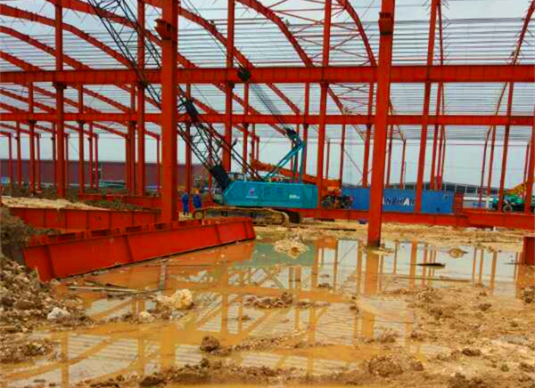 負責印尼加工中心建設工作的生產部經理張華說:“咱們對印尼的高溫多雨天氣真是欲哭無淚啊。”印尼地處赤道附近,熱帶雨林氣候特征明顯,一年中有半年在下雨,在路上走幾步就有細密的水珠往外冒。而加工中心所在的園區沒有市政排水設施,如果連續降雨,積水深處可達半米左右。基坑挖掘工程正趕上雨季,往往今天好不容易挖完的大基坑,大雨一沖,坑邊疏松的泥土塌方,一夜間就會恢復原狀,施工進度遠遠落后于目標。